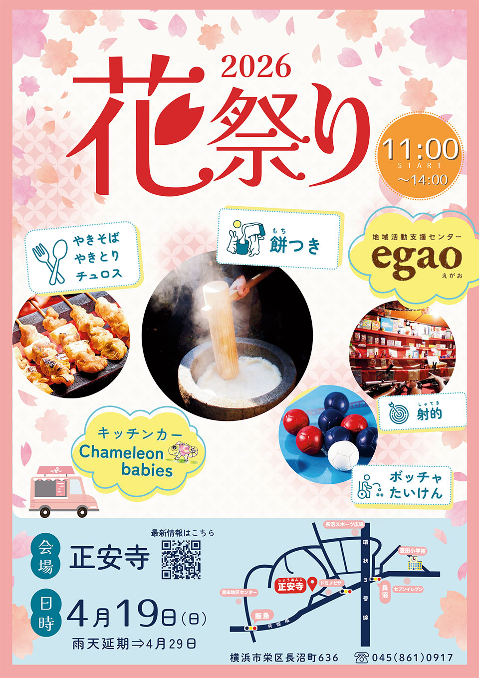 地域活動センターegaoの協力による射的やボッチャたいけん、餅つきややきそばやきとりチュロスの屋台、そしてキッチンカーも来場します。